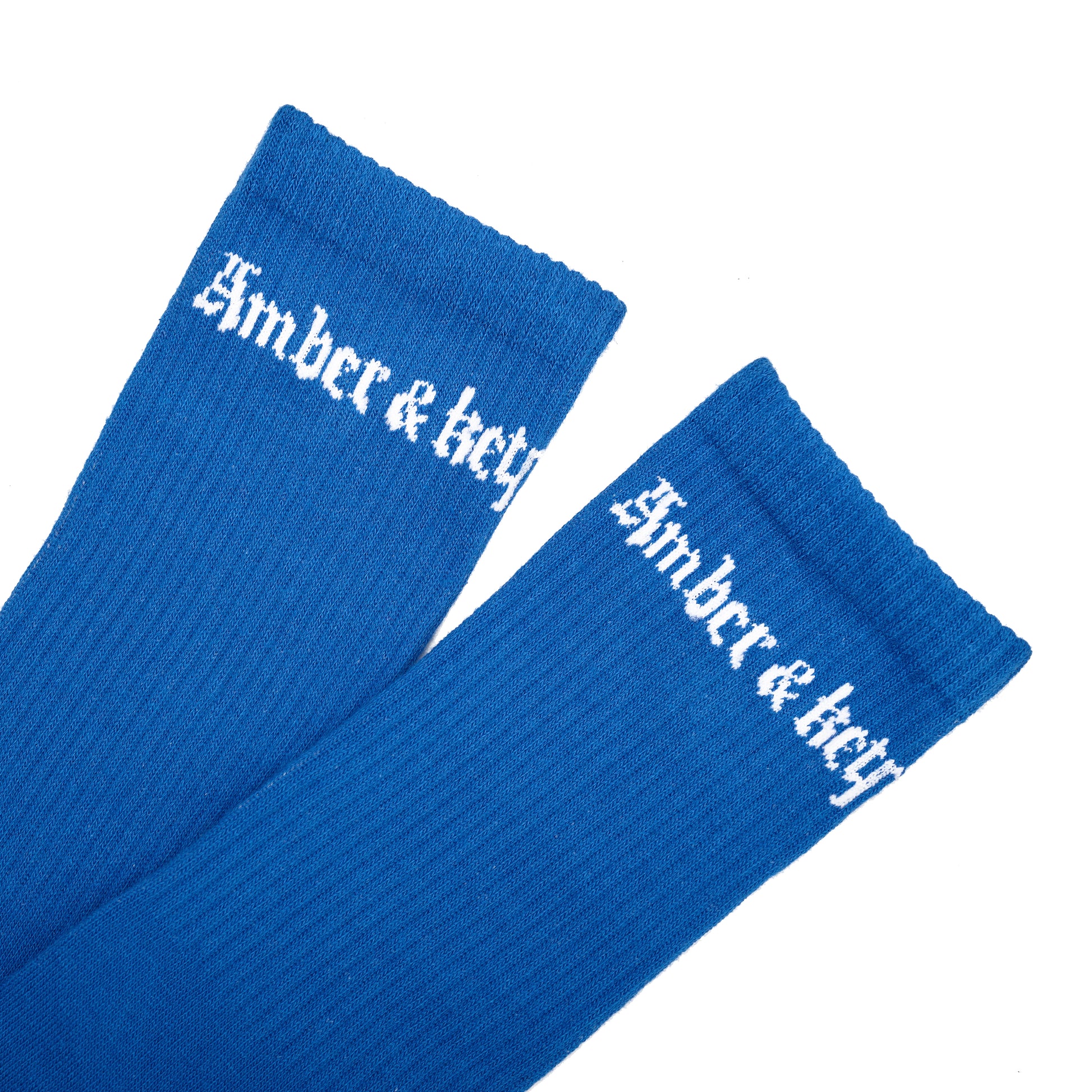Blue long cotton socks Amber&Key with brand logo embroidery.